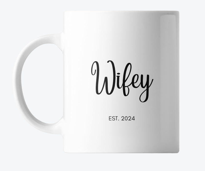 This 11oz mug features "Wifey est." and the established year. The perfect gift for newlyweds or to celebrate an anniversary. Made with durable ceramic, this mug is sure to be a cherished keepsake for years to come.